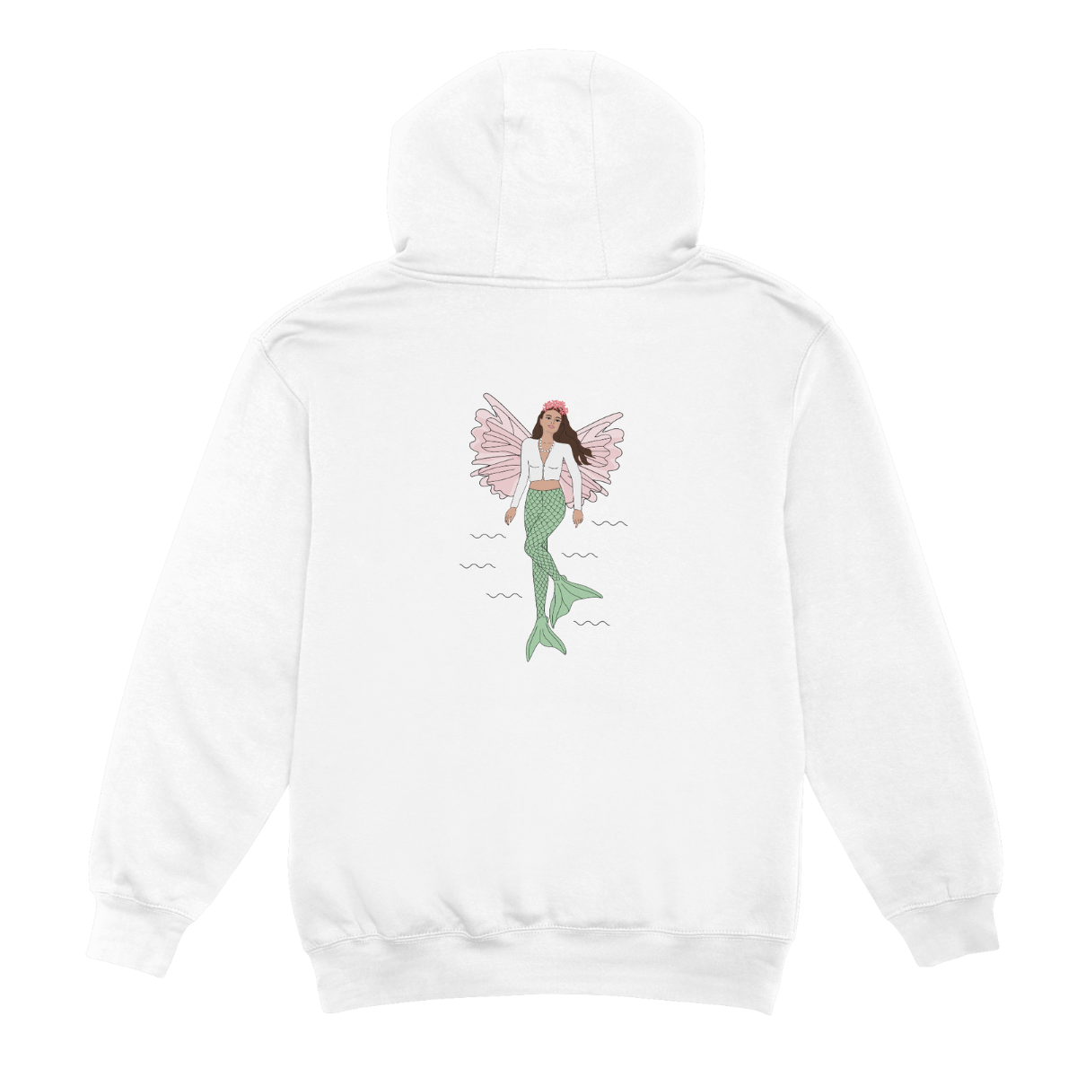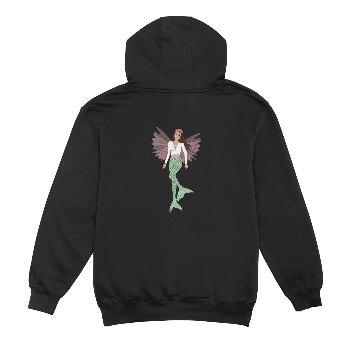 Una hoodie que protege tu esencia y muestra tu fuerza. Al frente, un escudo que honra la magia y la identidad; en la espalda, una sirena hada que despliega alas y piernas para recordarte que puedes ser delicada y poderosa al mismo tiempo. Hecha en 100% algodón, diseñada para quienes llevan su historia con orgullo.